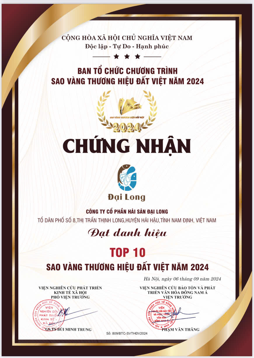 Công Ty Cổ Phần Hải Sản Đại Long Vinh Dự Nhận Chứng ...